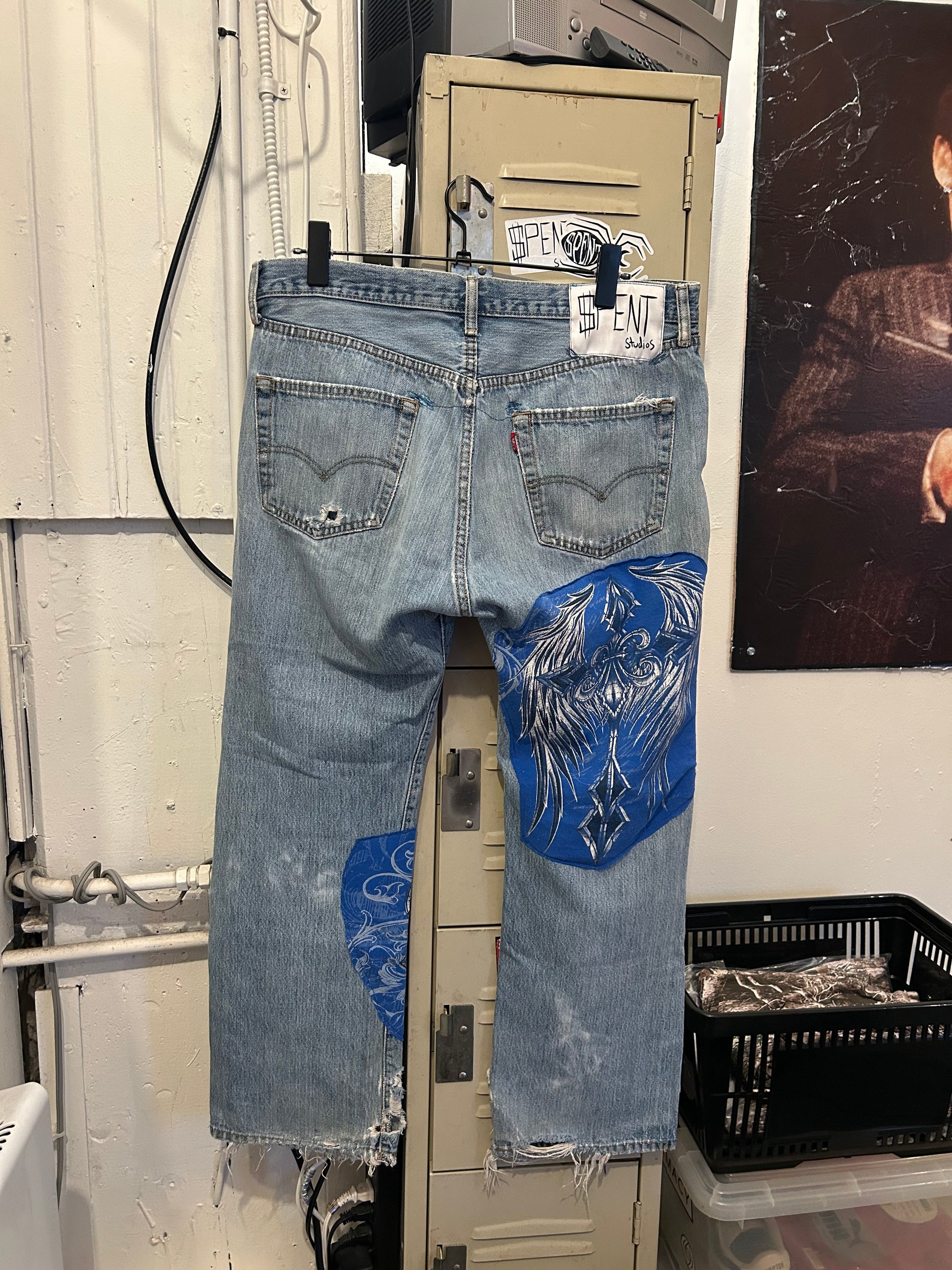 Vintage t shirt cut & sewn onto vintage thrashed Levi’s jeans.