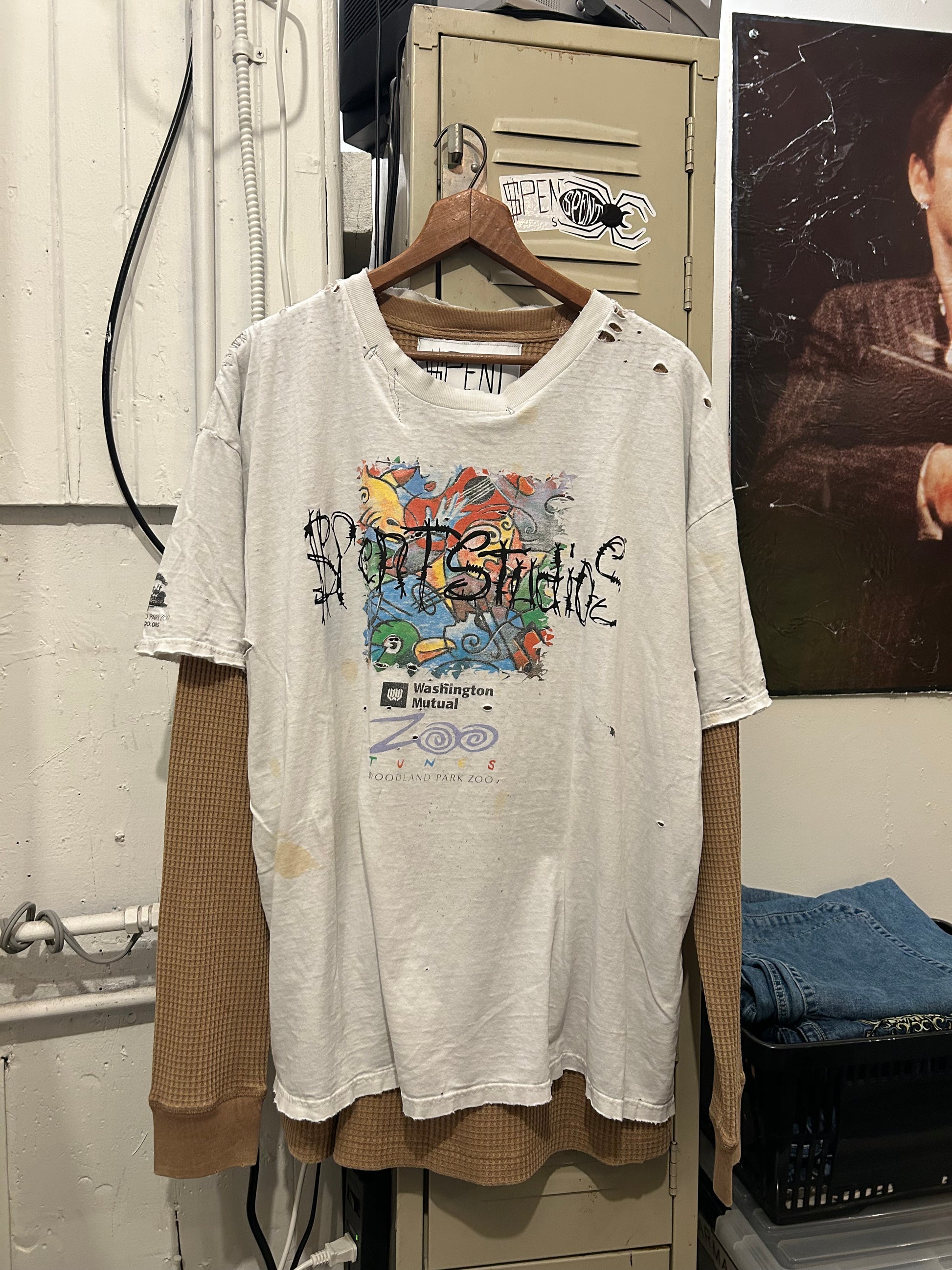 Vintage distressed t shirt with a screen printed logo over a high quality thermal shirt. Custom patchwork as well