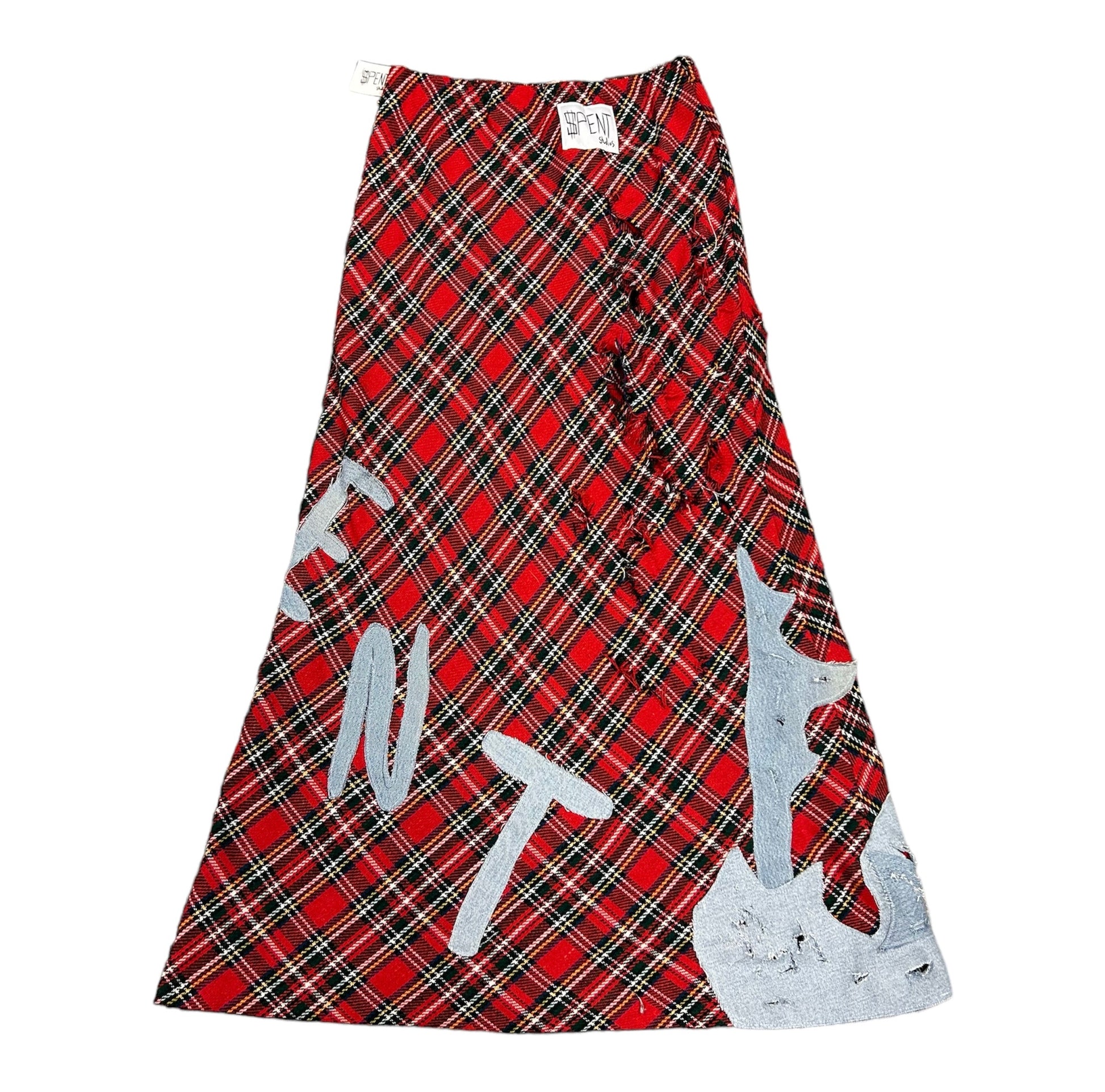 Jean flames & “$pent” cut & sewn onto a vintage plaid skirt. Distressed on 1 side